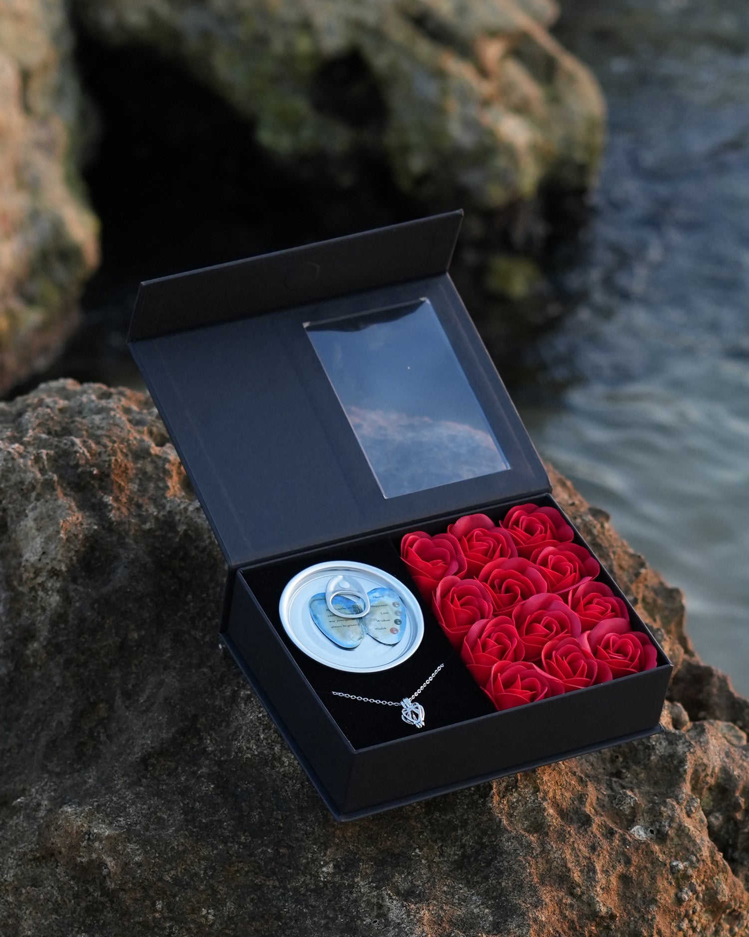 Pearl Éternelle offers an unforgettable experience. Each luxurious box includes a sealed shell with a 100% natural pearl, a silver necklace to hold it, and elegant scented roses.